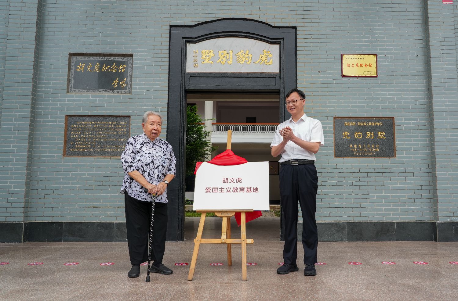 5月13日,胡仙(左)在修缮一新的虎豹别墅门前共同为“胡文虎爱国主义基地”揭牌。(永定区融媒体中心供图)