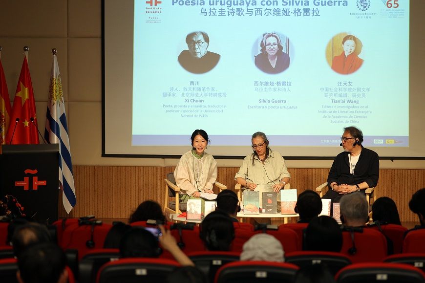 北京塞万提斯学院13日晚举办了一场特别的圆桌座谈会,来自乌拉圭的诗人西尔维娅·格雷拉(Silvia Guerra)、中国诗人西川以及西班牙语诗歌译者汪天艾在现场共同探讨了他们的最新作品及创作灵感,一起品鉴诗歌之美。