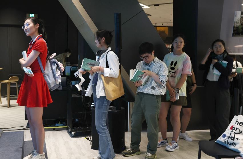 2024年5月17日,阿根廷裔美国作家埃尔南•迪亚斯(HernánDíaz)携其小说《信任》,在北京与中国读者见面。图为中国读者手持《信任》,排队等候埃尔南•迪亚斯为自己签名。(卞程宣摄)