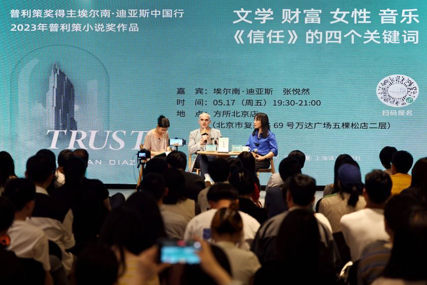 17日的活动是埃尔南·迪亚斯此次中国行的最后一站,他与中国作家张悦然一起,从“文学”“财富”“女性”“音乐”四个关键词出发,与中国读者畅聊《信任》这部作品的写作始末。
