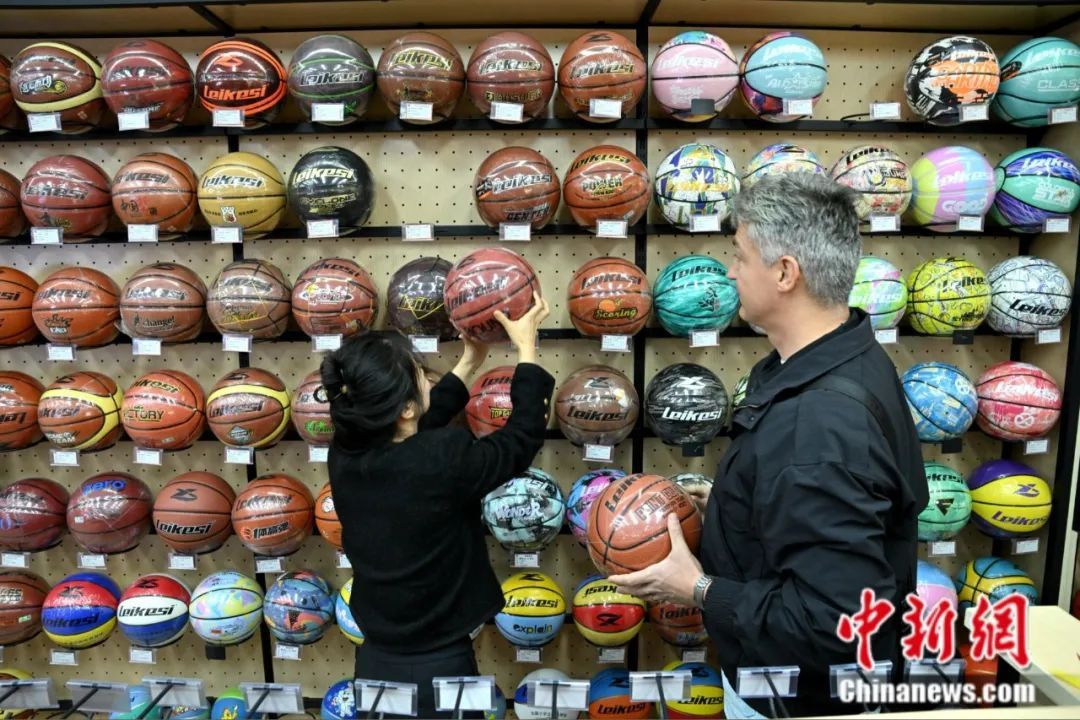 义乌国际商贸城三区体育用品区,来自德国的客商正在选购篮球。中新网