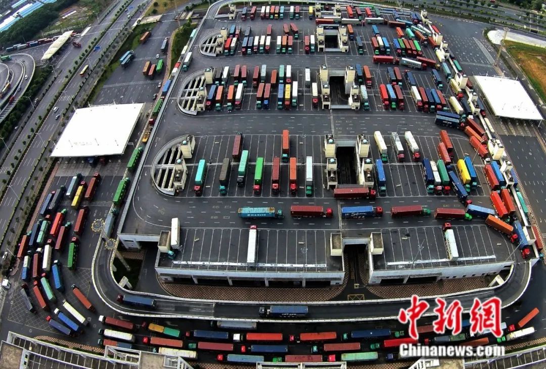 义乌港,等待通关的集装箱货车满载着出口体育用品等商品,排起长长队伍。中新网