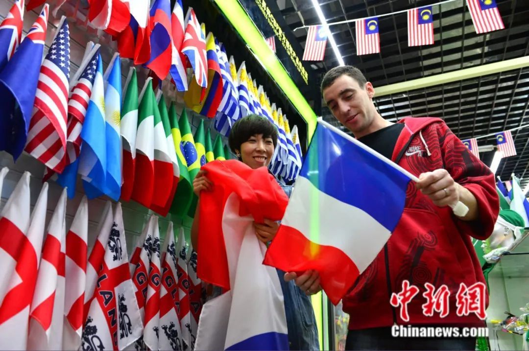 外商在义乌国际商贸城采购奥运会参赛国旗帜。中新网