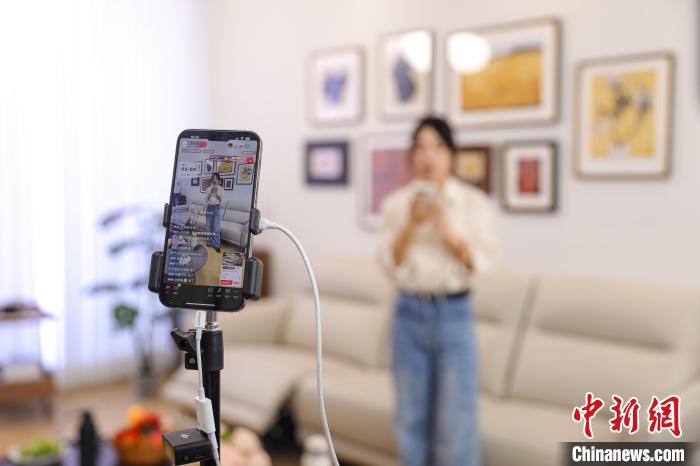 6月13日,网络主播在山东省青岛市一处产业园内直播带货。中新网