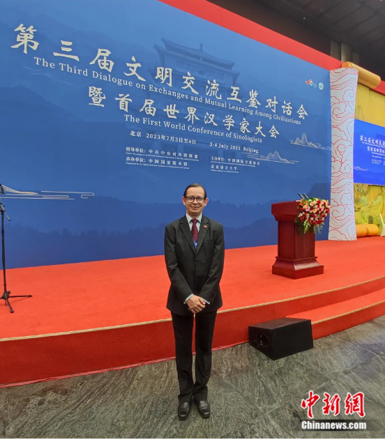 2023年7月,梁中来在北京参加第三届文明交流互鉴对话会暨首届世界汉学家大会。中新网