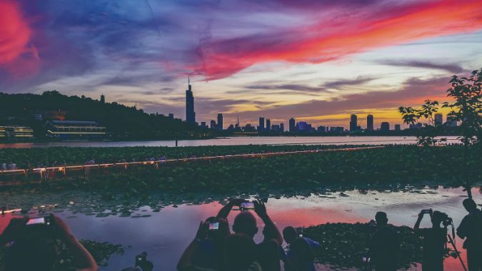 23日,正处梅雨期的南京“暂别”阴雨天,傍晚的天空“绽放”出绚丽的晚霞。中新社