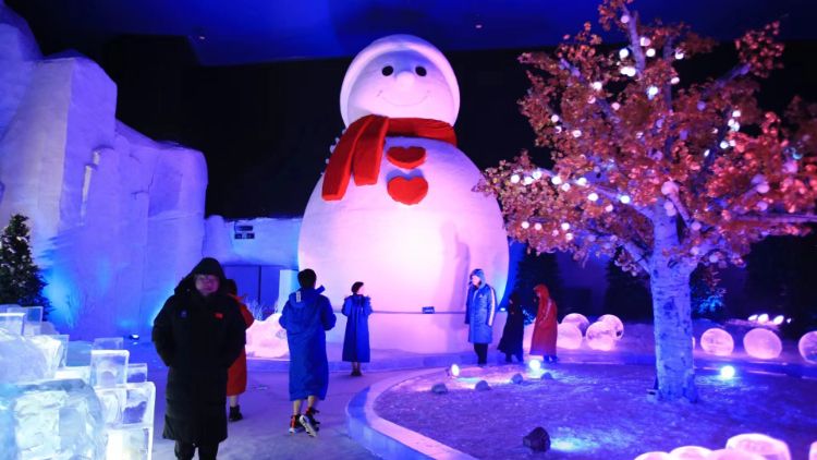 哈尔滨网红大雪人亮相冰雪小世界(室内冰雪馆)。中新社