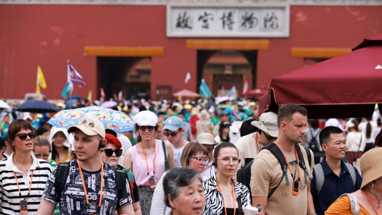7月9日,外籍游客参观北京故宫博物院。中新社