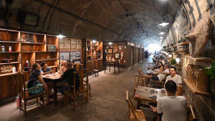 在重庆市九龙坡区,陈焕文将一个防空洞改造成艺术空间,洞顶绘有《星空》,座次排列成“绿皮火车”主题。他介绍:“这个防空洞体感温度22℃左右,现在天气热了,平均每天有近一两百人来纳凉,我们也会售卖消暑饮料。”
