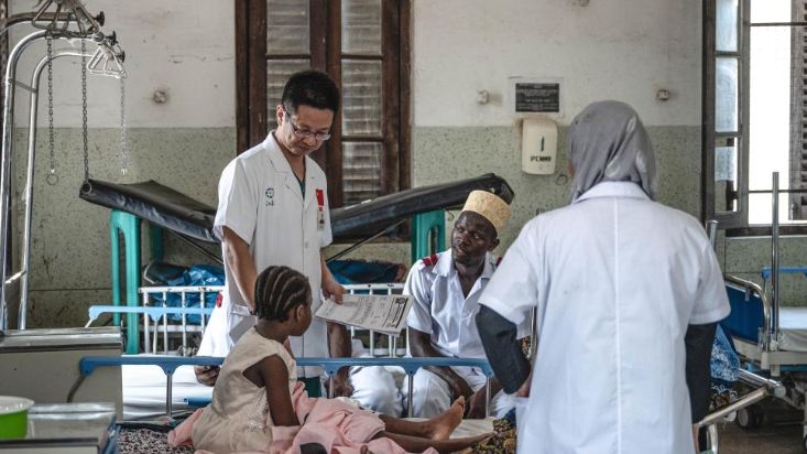 2023年12月29日,中国援桑给巴尔医疗队队长蒋国庆(左)在坦桑尼亚桑给巴尔的纳兹莫加医院查房。新华社