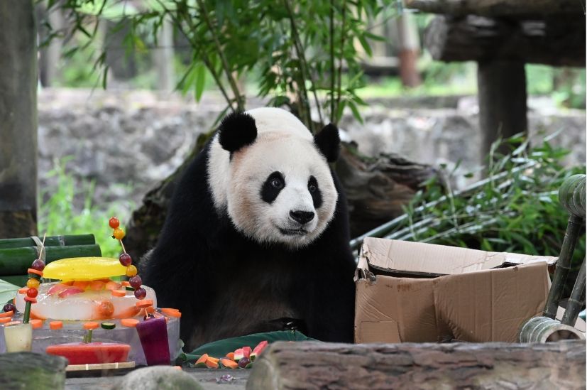 8月9日,中国大熊猫保护研究中心都江堰基地举行大熊猫集体生日会,大熊猫“张卡”在生日会上享用美食。中新社