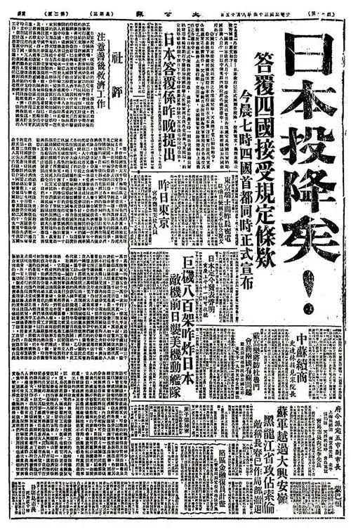 “日本投降矣!”,1945年8月15日,上海《大公报》头版,用超大号的五个铅字,宣告这一重大消息,这一天,日本天皇宣布接受盟国的《波茨坦公告》,无条件投降。