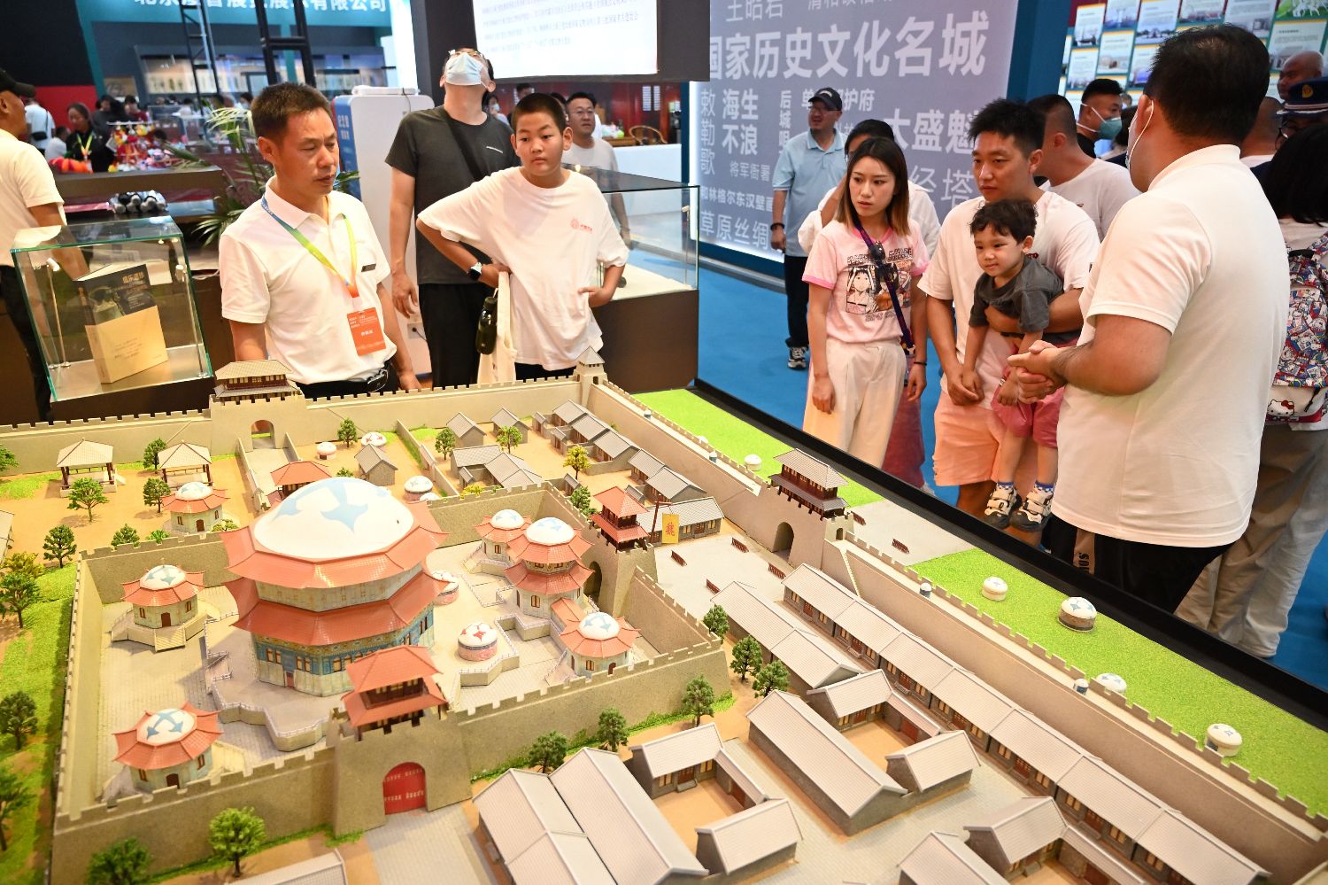 8月23日,内蒙古呼和浩特,游客在第十届“博博会”现场观看盛乐古城的沙盘图。中新社展会现场最为吸睛的莫过于博物馆数智化专题展示区。组委会遴选了中国最热门博物馆中高质量的数字展示和智慧化建设案例,包括南京博物院“物华天宝——数字文物之美”、三星堆博物馆“寻觅三星堆——祭祀坑考古发掘现场”VR沉浸式探索体验、扬州中国大运河博物馆“运河上的舟楫”沉浸式数智展览、浙江省博物馆“云上浙博”等。