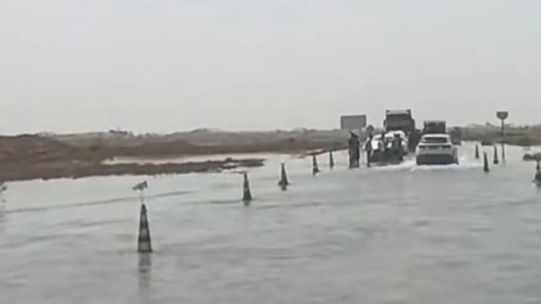24日,新疆塔克拉玛干沙漠,洪水淹没至道路,很多车辆因此熄火。乌鲁木齐“新疆广播电视台”