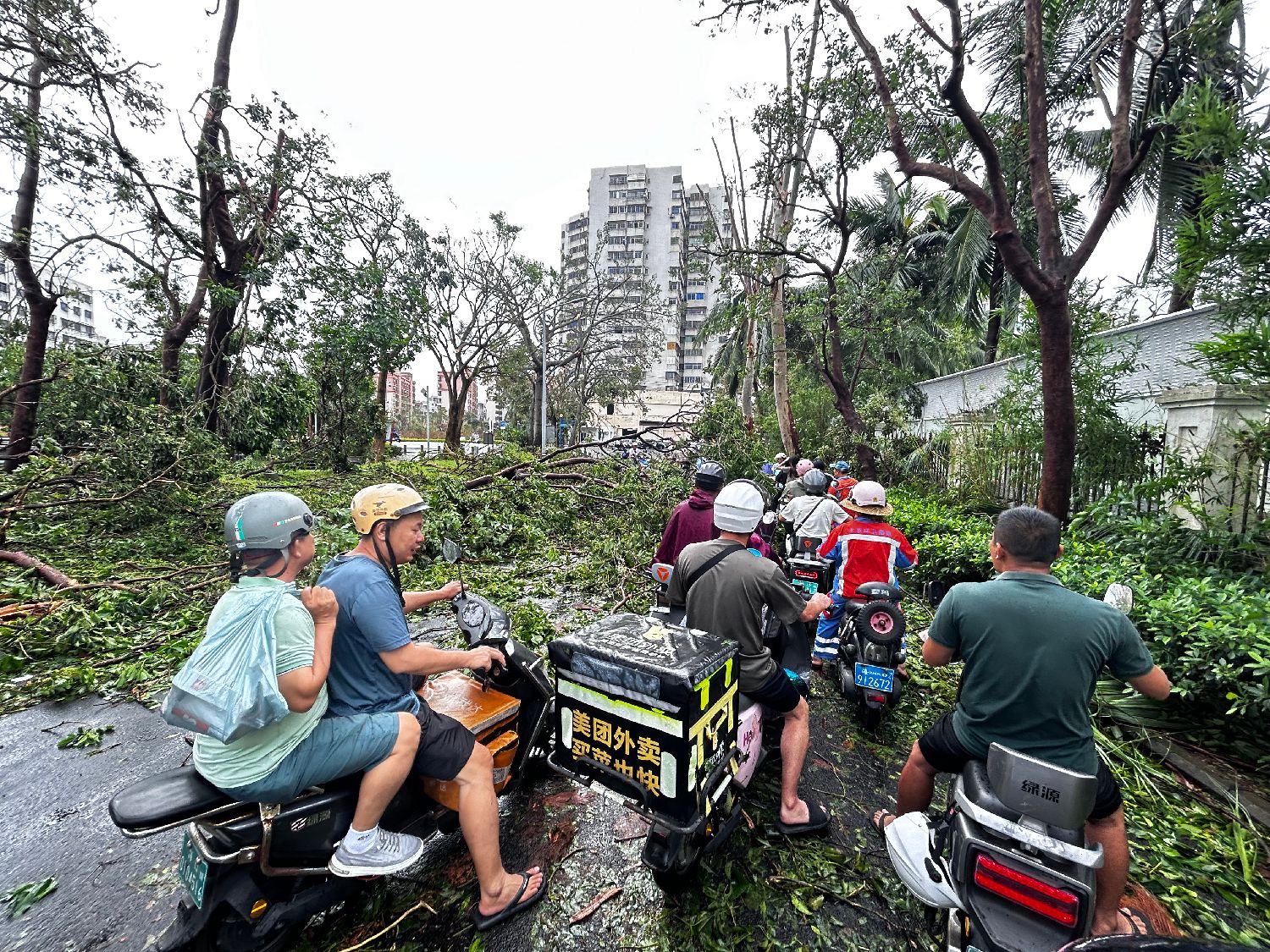 7日,海南海口,市民经过一段铺满断枝的街道。中新社
