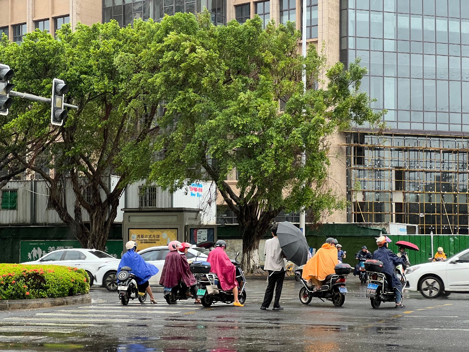 19日,今年第15号台风“苏力”生成,海南岛迎风雨天气,海口市民在雨中出行。中新社