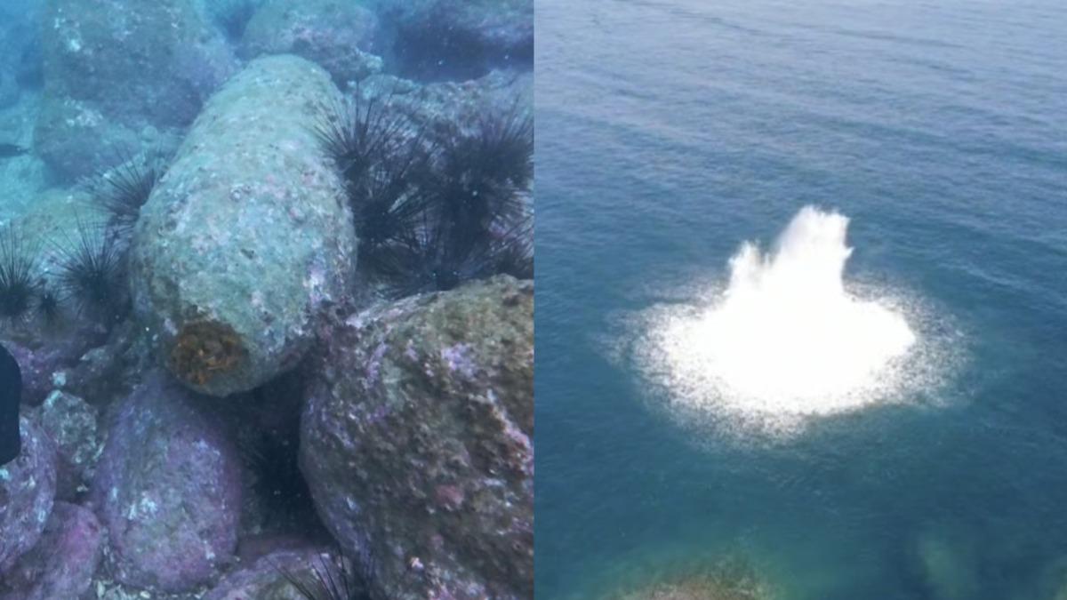 香港发现一枚二战时期日式500磅空投炸弹,图右为炸弹引爆后水花四溅。香港警方FB