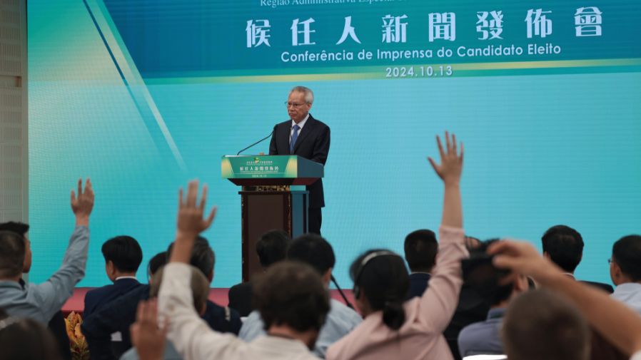 澳门特区行政长官候任人岑浩辉出席新闻发布会回答记者提问。香港中通社