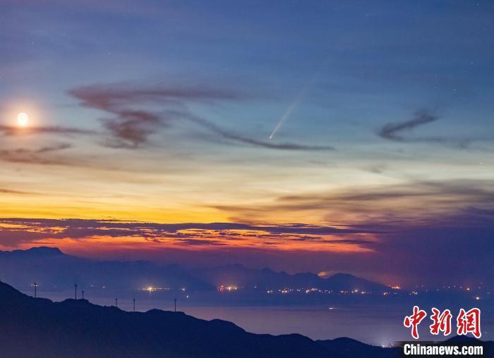 10月1日,广东台山夜空,C/2023A3彗星与月亮同框。中新网