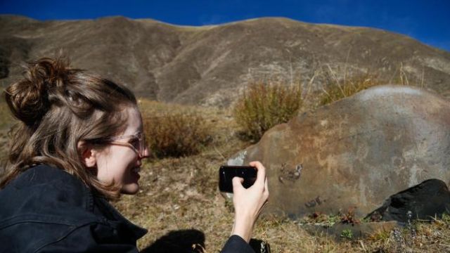 而后,活动嘉宾一行在称多县境内的山体上寻找着古老岩画,试图通过图案了解先民的生产生活和社会风貌。