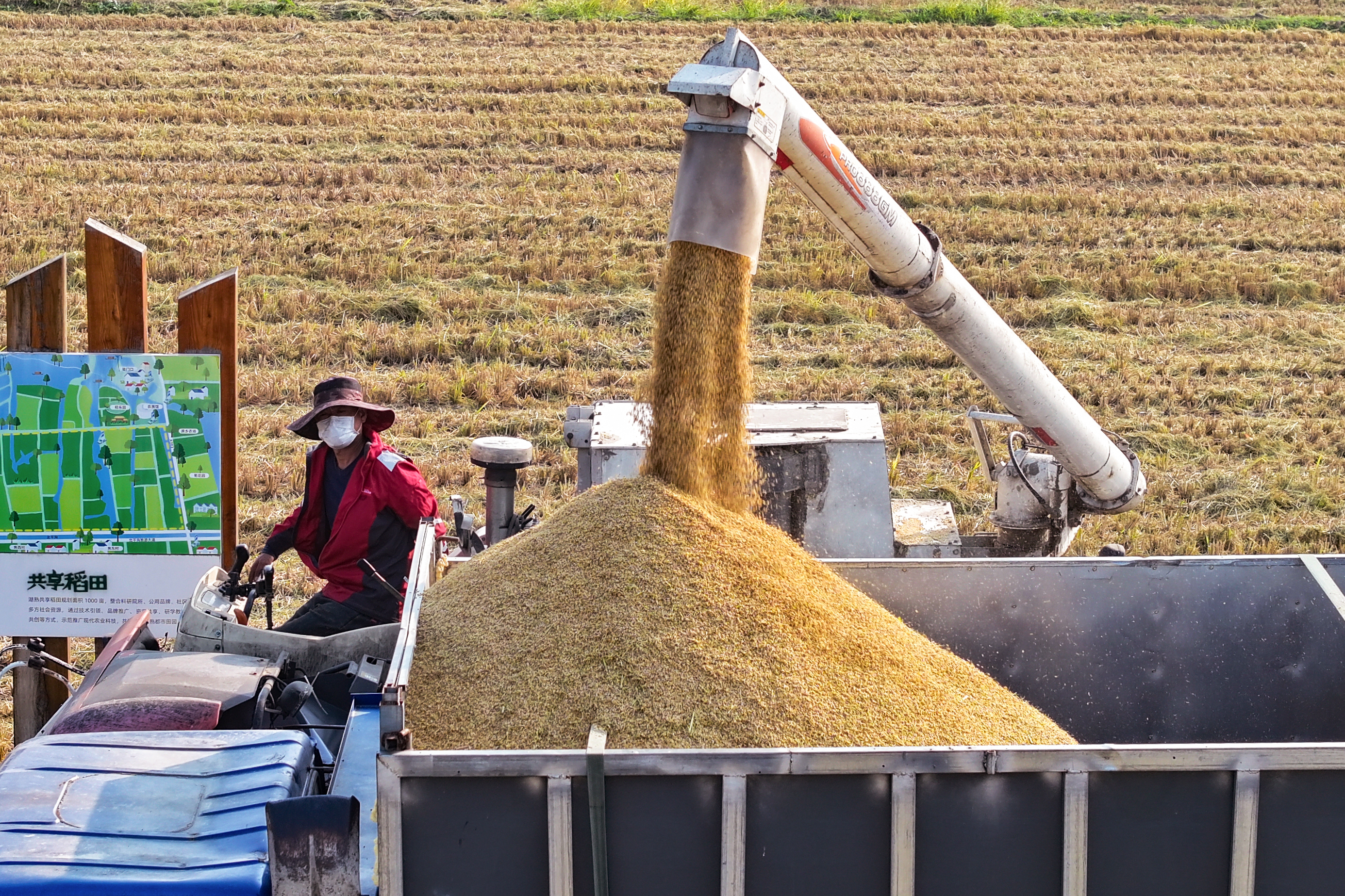 11月12日,江苏南京湖熟现代农业示范园里,工作人员驾驶着收割机将收割的水稻装车。中新社