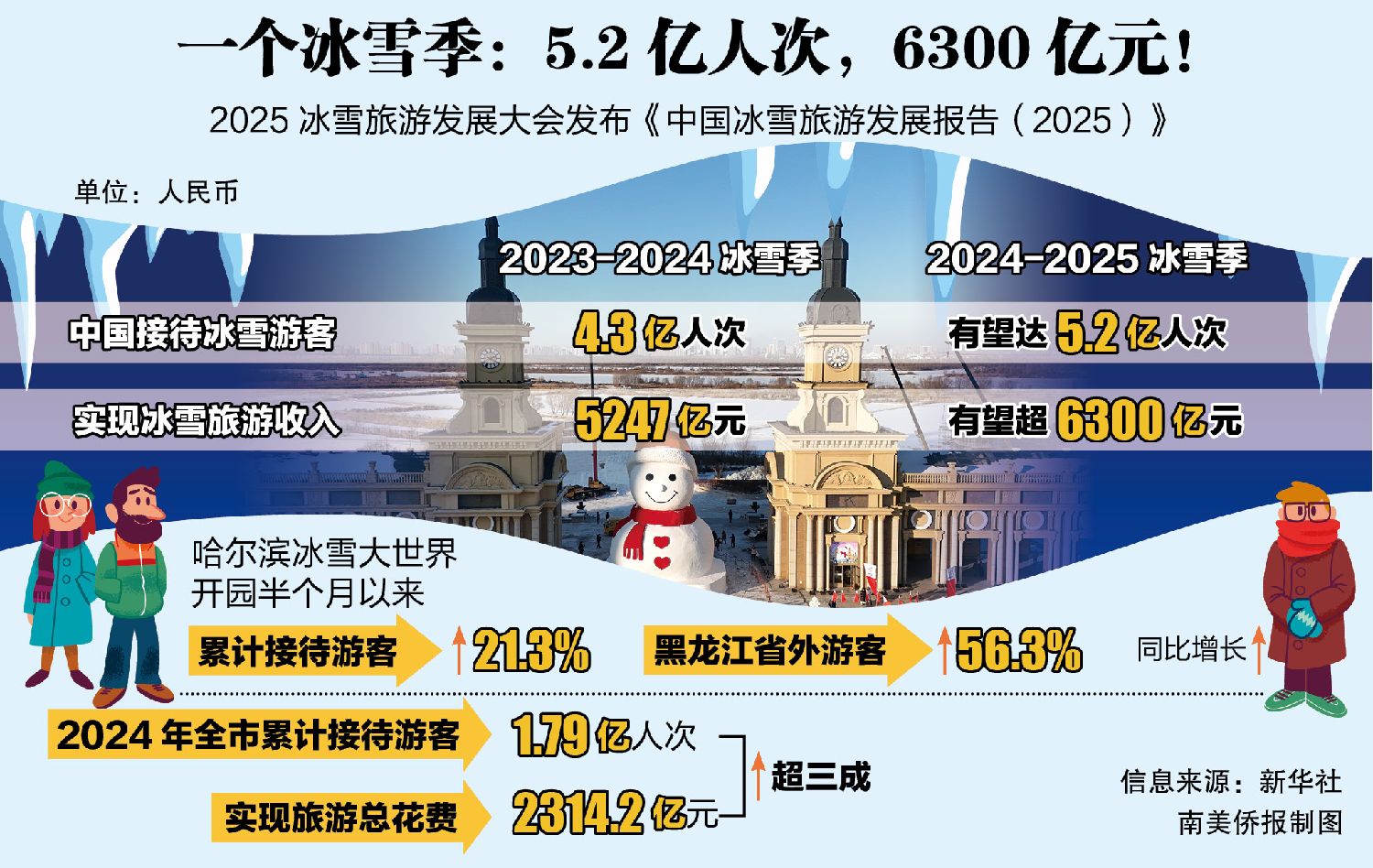 数据见证“尔滨”“冰雪热”:哈尔滨冰雪大世界开园半个月以来,全市累计接待游客同比增长21.3%;2024年全市累计接待游客1.79亿人次,实现旅游总花费2314.2亿元(人民币,下同),同比增长均超三成……