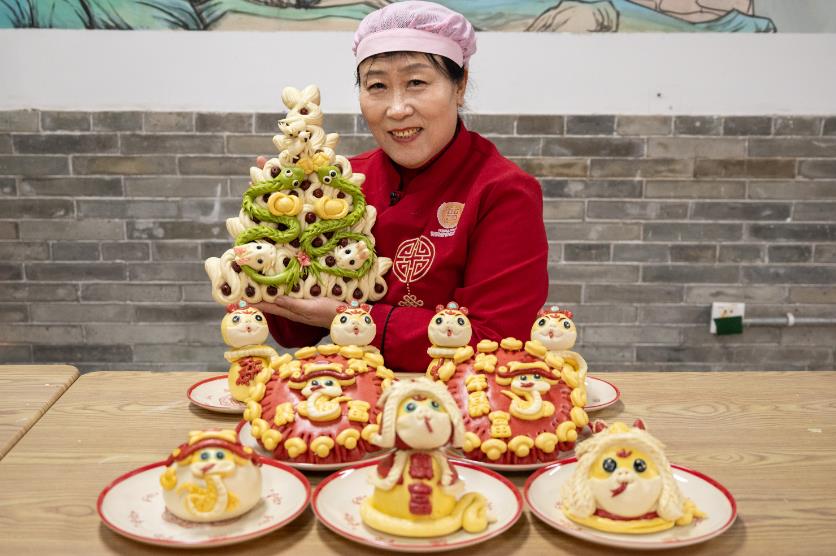 1月10日,山西省太原市,山西花馍非遗传承人续爱花展示她制作的蛇年特色花馍。中新社
