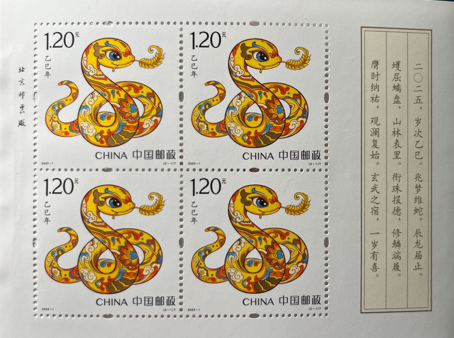 《乙巳年》特种邮票第一图“蛇呈丰稔”。中新社