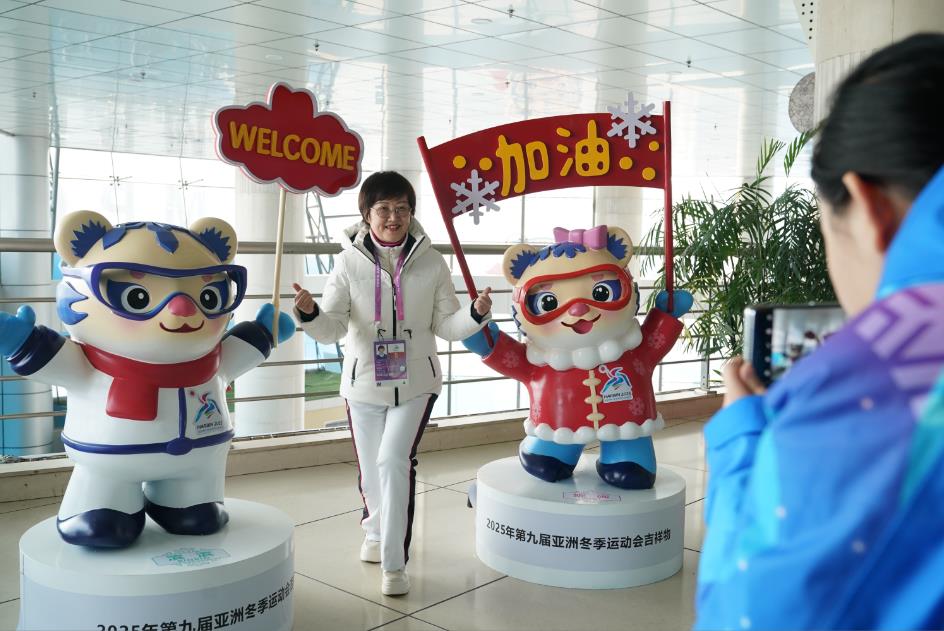 2月2日,黑龙江哈尔滨,第九届亚冬会主新闻中心内亚冬会吉祥物吸引媒体记者拍照。中新社
