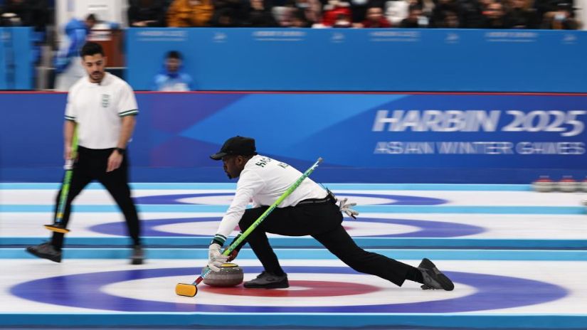 10日,沙特冰壶队选手侯赛因·哈加维(右)在比赛中。新华社