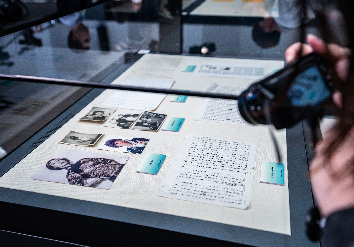 图为12日捐赠仪式现场展示的张爱玲照片、手稿等。中新社