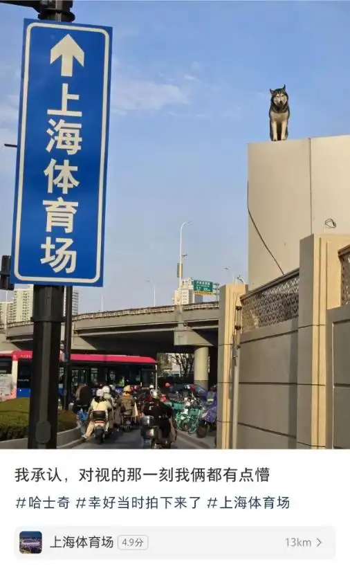 近日,一上海网民发帖表示,自己经过上海体育场附近时猛一抬头发现一只哈士奇在半空中看着自己。放大一看,它脸上还带着蒙娜丽莎一般的神秘微笑。