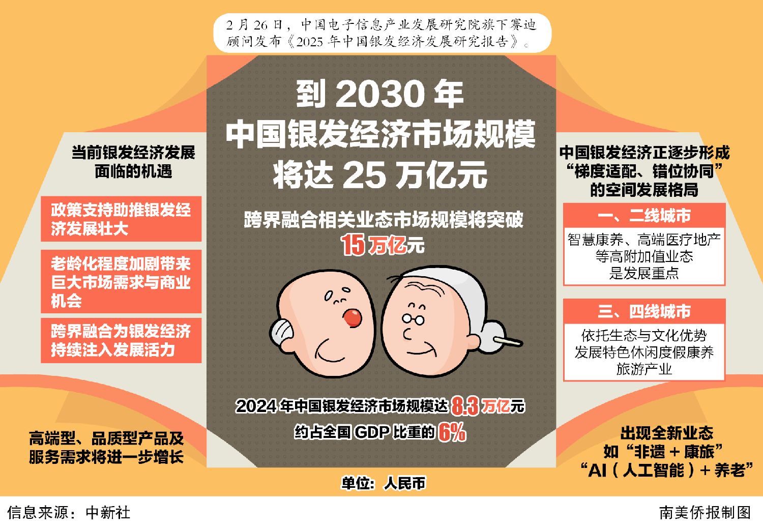 中国电子信息产业发展研究院旗下赛迪顾问26日发布的《2025年中国银发经济发展研究报告》预计,到2030年,中国银发经济市场规模将达到25万亿元(人民币,下同),经济带动能力进一步提升。