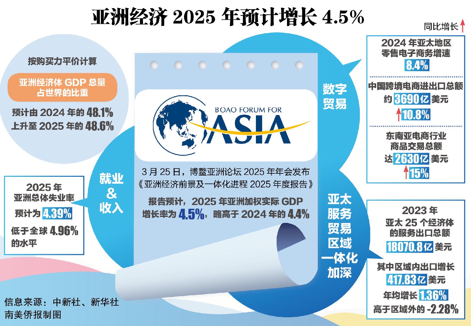 《亚洲经济前景及一体化进程2025年度报告》指出,尽管世界经济增长的不确定性增大,但亚洲仍将成为世界经济的主要引擎。预计2025年亚洲加权实际国内生产总值(GDP)增长率为4.5%,略高于2024年的4.4%。