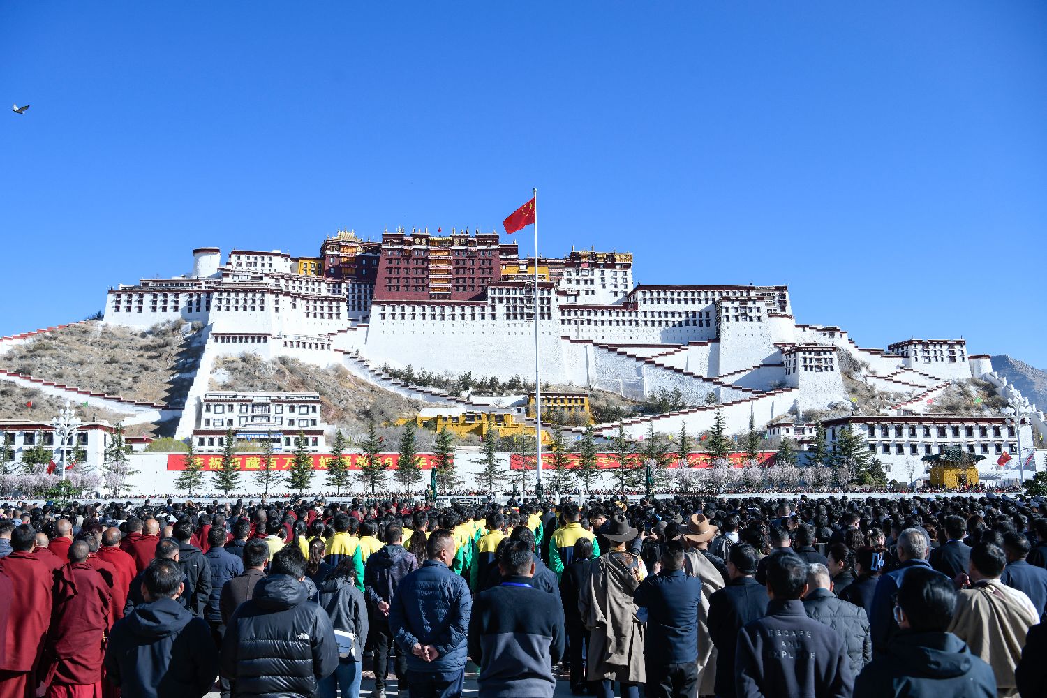 28日,西藏各族各界人士聚集在拉萨布达拉宫广场,升国旗、唱国歌,参加西藏百万农奴解放66周年纪念活动。图为升国旗仪式现场。中新社