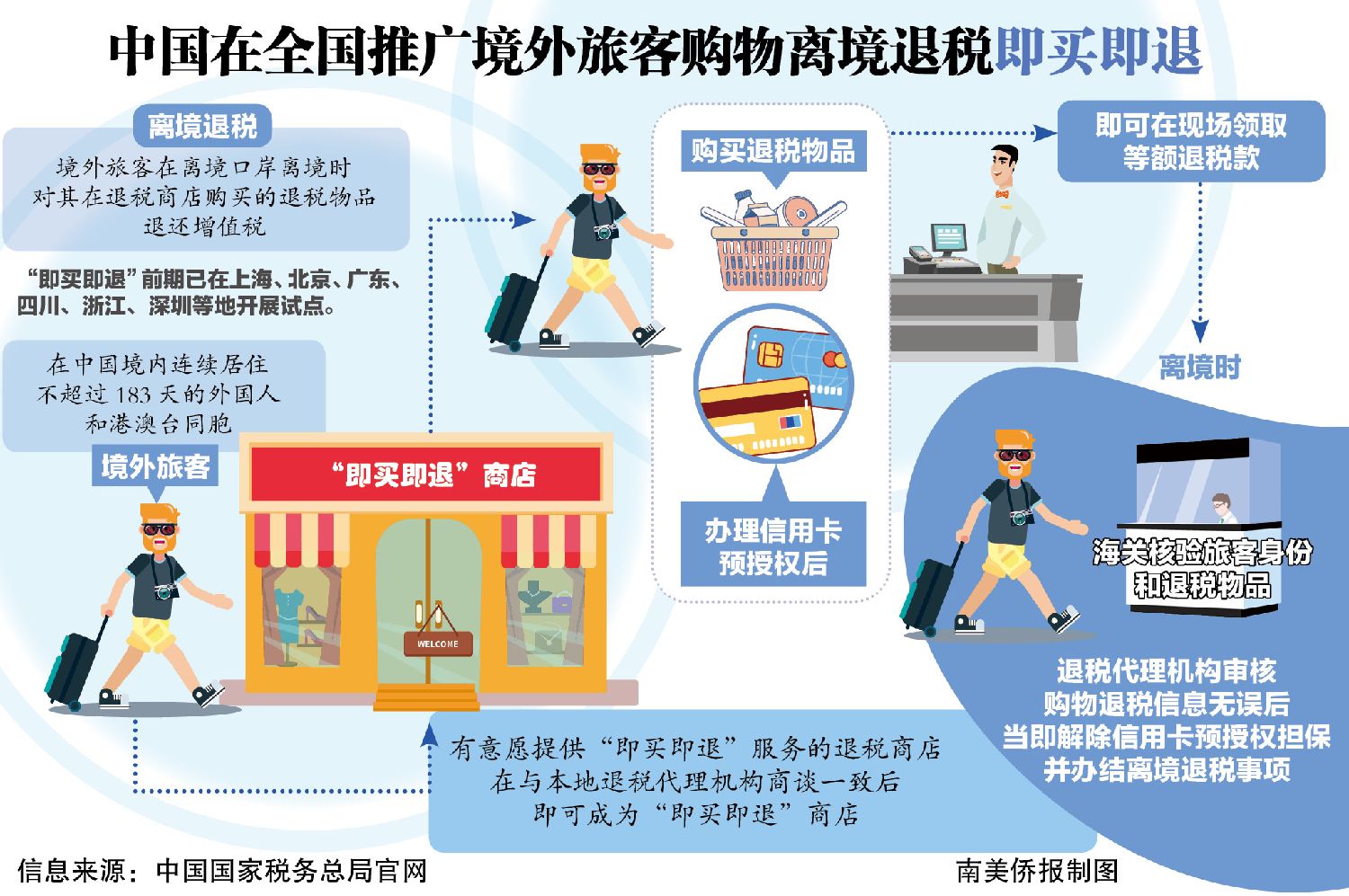 中国国家税务总局8日发布《关于推广境外旅客购物离境退税“即买即退”服务措施的公告》(下称“公告”),对离境退税“即买即退”的主要内容、办理流程和施行时间作出明确规定,将该项服务措施从多地试点推广至全中国。