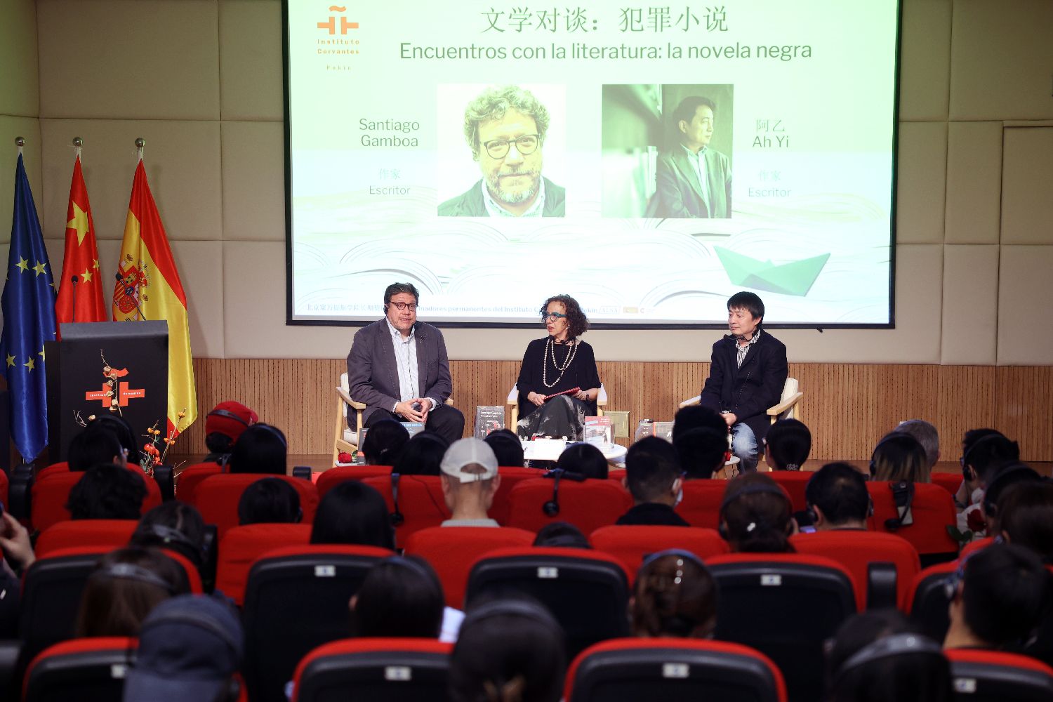 23日,哥伦比亚作家Santiago Gamboa(左)和中国作家阿乙(右)及北京塞万提斯学院院长伊莎贝尔·塞韦拉在活动现场对谈。李久骏/摄