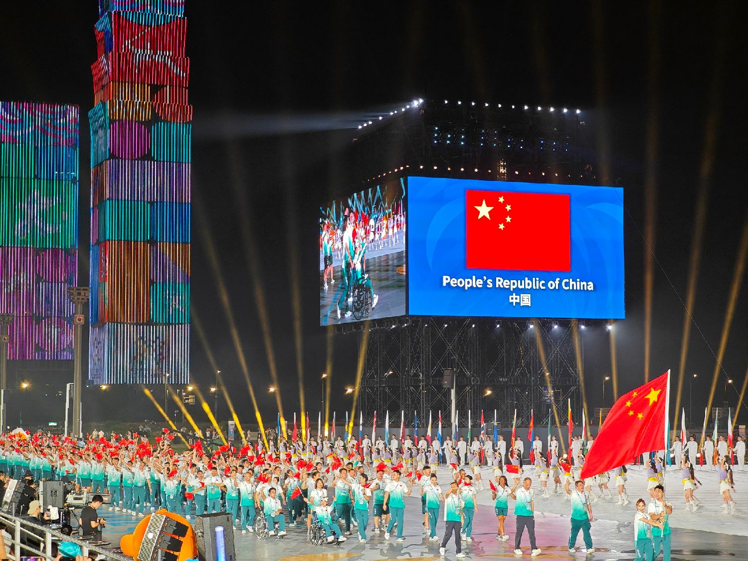 大陆央视新闻客户端报道,开幕式上,伴随着《茉莉花》的动人旋律,东道主中国代表团入场。旗手是男子技巧运动员史经纬、女子轮滑运动员郭丹。