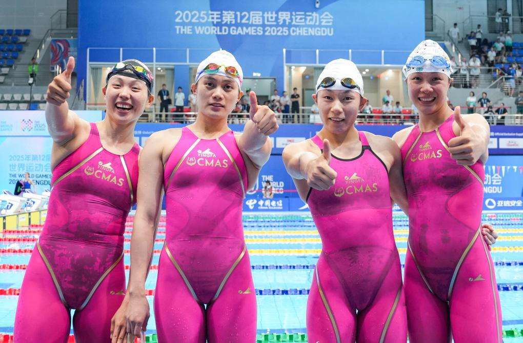 在10日进行的2025年成都世运会女子4×50米水面蹼泳接力决赛中,中国队以1分07秒99的成绩夺得冠军并创造新的世界纪录。新华社