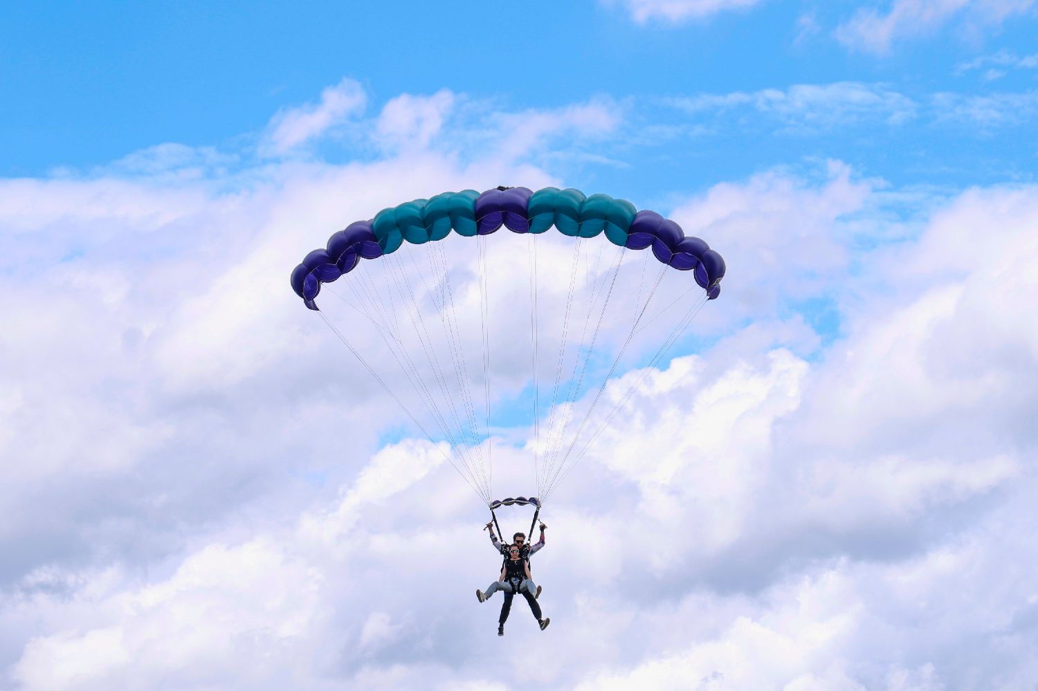 7月,在浙江杭州一跳伞基地,跳伞教练带着游客体验跳伞。中新社