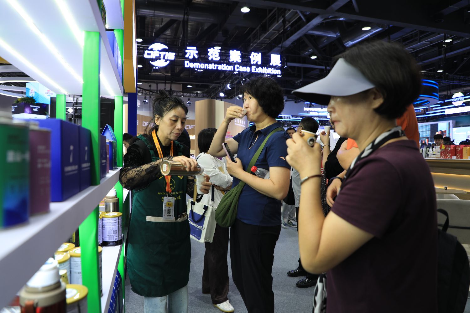 12日,中国国际服务贸易交易会(下文简称“服贸会”)主题展区,观众在巴西圣保罗州投资促进局的展台前品尝巴西阿拉比卡咖啡。(宋屿/摄)