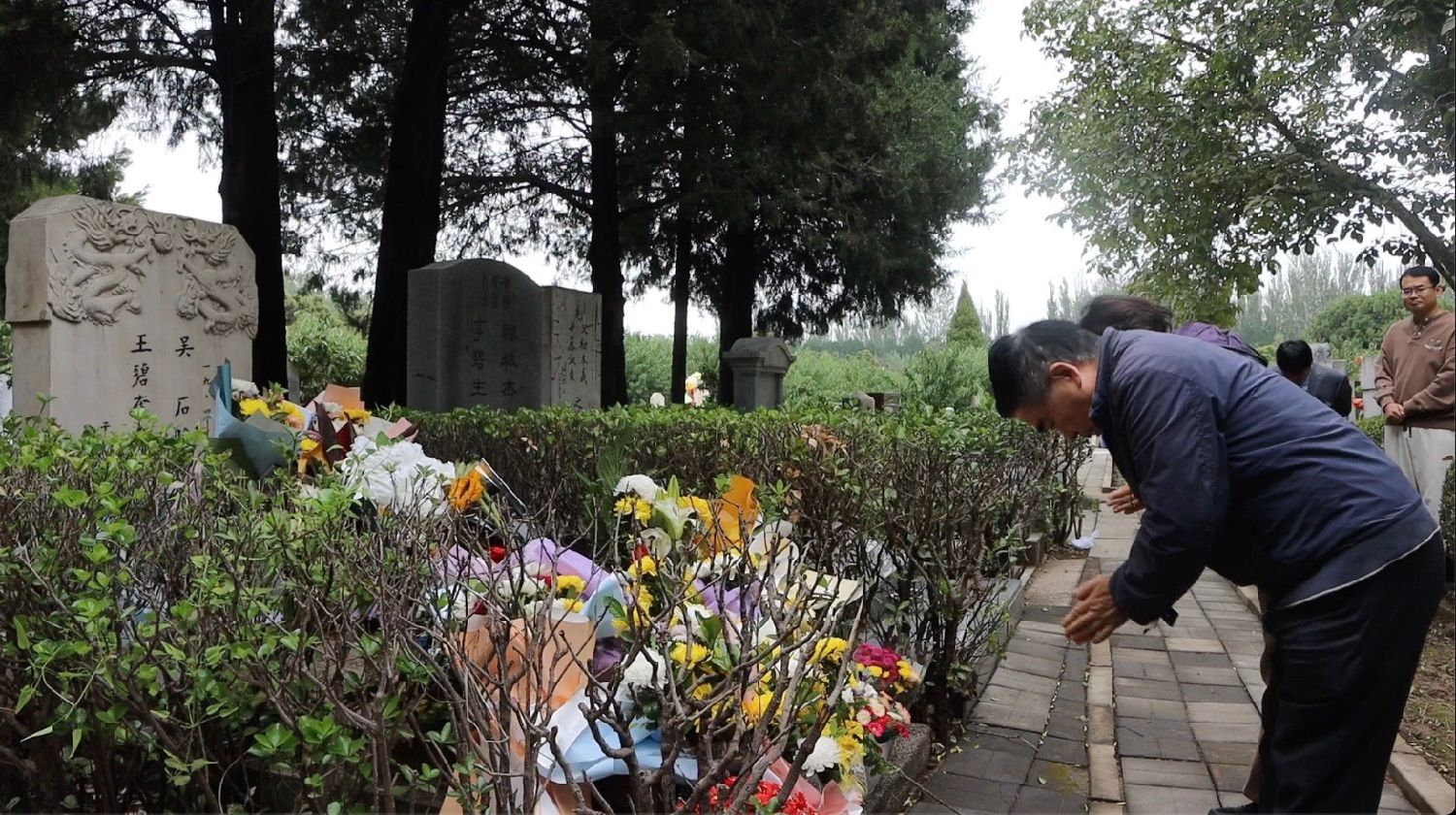 12日,北京市福田公墓内草木凝露,空气清润。中共台湾隐蔽战线烈士吴石与夫人王碧奎的合葬墓前堆叠许多鲜花。前来祭奠的王晶羽正在将手中花束添至鲜花丛中,退后、深深鞠躬。