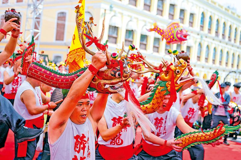 “鱼行醉龙节”舞醉龙队伍在澳门议事亭前地进行表演。新华社