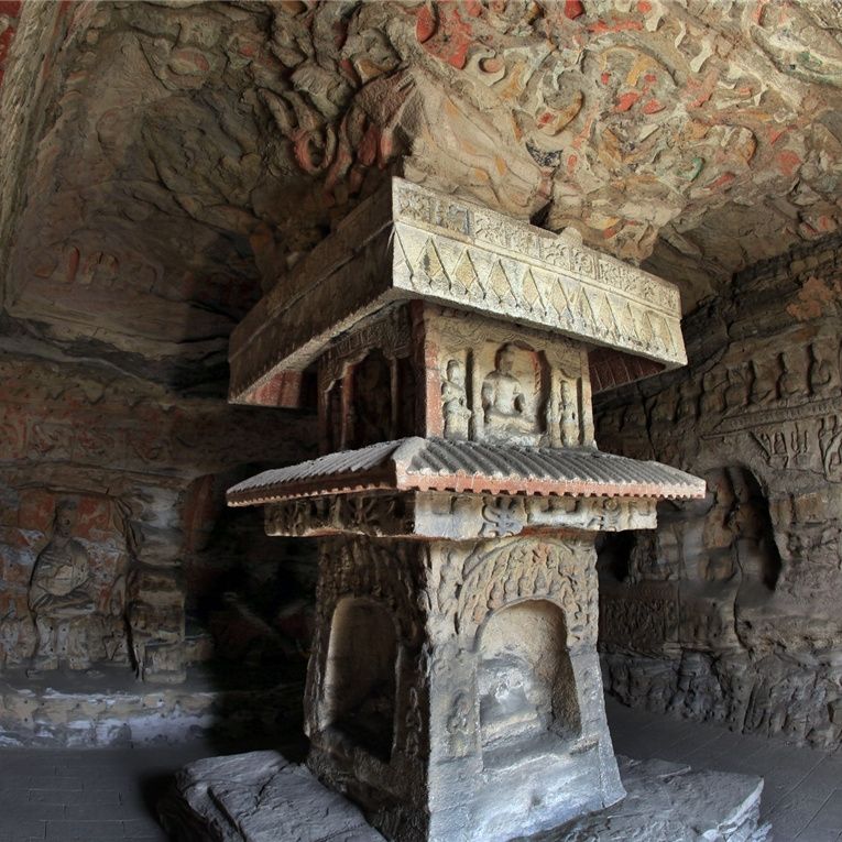 云冈石窟第1窟的中心柱塔。中新社