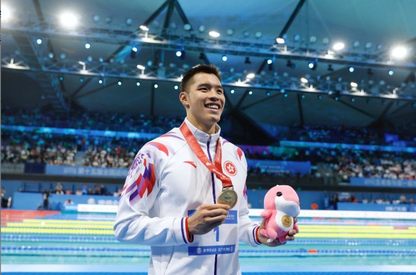 香港《文汇报》报道,16日,28岁的香港选手何甄陶16日在强项男子50米自由泳决赛中展现惊人爆发力,以21.71秒打破个人保持的香港纪录,力压潘展乐夺金,取得香港泳队史上首面全运会男子赛事金牌,成为香港“男飞鱼”。
