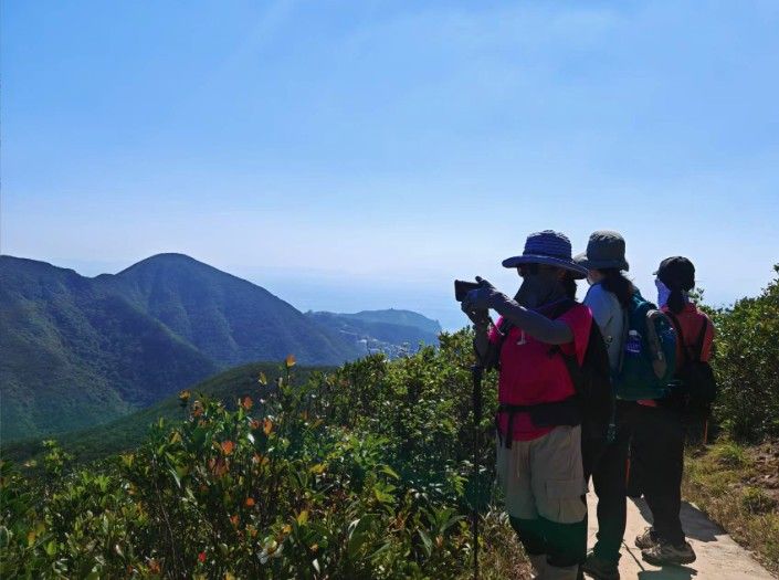 近年来,户外远足成为不少都市人向往的运动。每逢节假日,香港户外行山热门线路,赤柱峡道、孖岗山和紫罗兰山,成为市民和不少内地访港人士喜欢的地方。图为游客在香港登山远眺。香港中通社