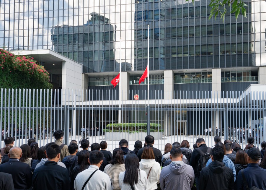 11月29日,香港特区政府总部国旗和区旗下半旗,部分香港民众在特区政府总部前肃立,向大埔宏福苑火灾罹难者表达哀思。中新社
