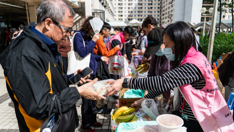 11月27日,香港大埔宏福苑火灾事故发生翌日,社区关爱队、热心市民等各界人士在事故现场附近为需要帮助的市民提供关爱协助。中新社