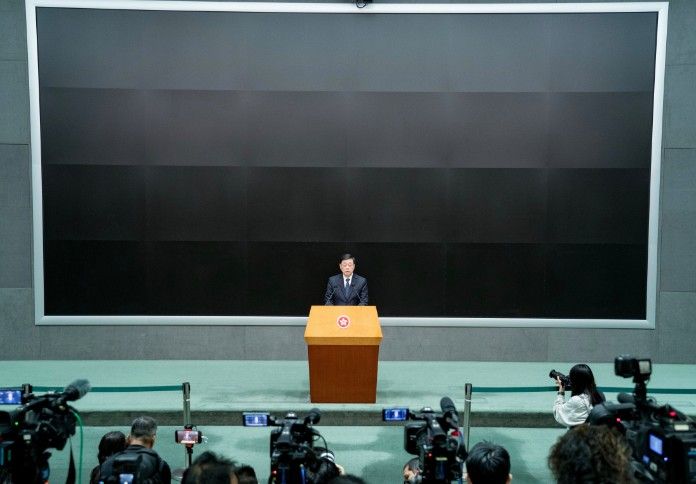 12月2日,香港特区行政长官李家超出席行政会议前在特区政府总部会见记者,现场大屏幕设置为黑色,以悼念大埔宏福苑火灾罹难者。中新社