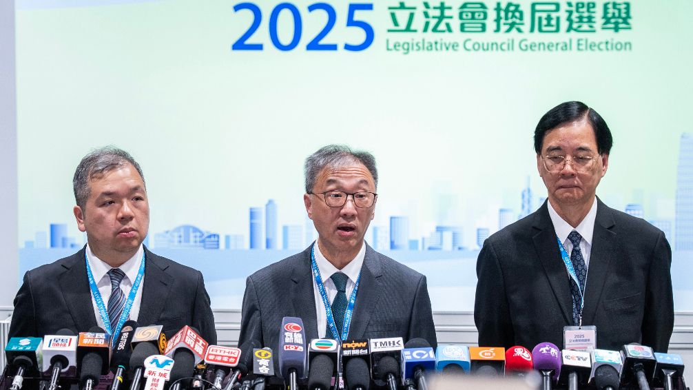 北京时间8日凌晨,香港特区选举管理委员会主席陆启康(中)等在位于香港会议展览中心的中央点票站新闻中心会见记者,介绍香港特区第八届立法会选举的投票情况。中新社
